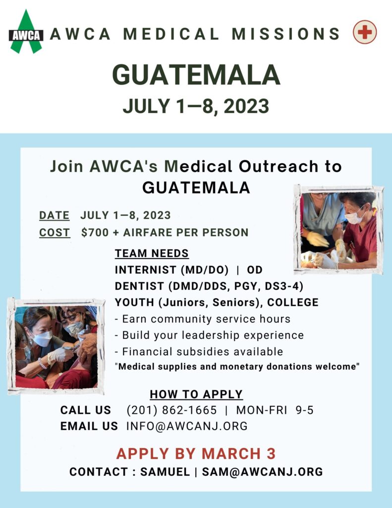 AWCA Medical Missions is privileged to serve the families and children in Guatemala this July, 2023. Be part of our passion and vision to carry love in action to those in need overseas through medicine as a medical professional, youth/young adult volunteer, and/or as a monetary/medical supply donor 💊