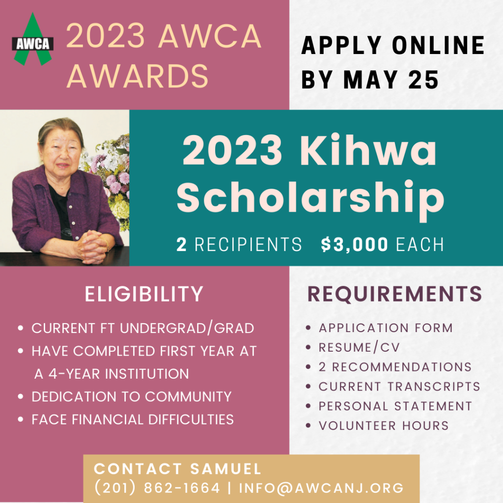 The Kihwa Scholarship was established to support the dreams of college and graduate school students who demonstrate dedication to academic achievement and community service but face difficult circumstances. The scholarship was named after its founder, the late Ms. Kihwa Kwak, and this year marks its 20th year of giving back to the community. The Kihwa Scholarship awards a total of $6,000 each year to 2 recipients ($3,000 per student) for the following academic year.