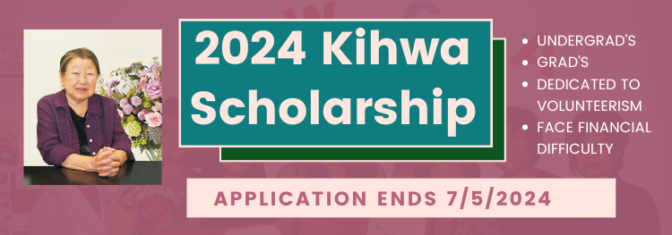 The Kihwa Scholarship was established to support the dreams of college and graduate school students who demonstrate dedication to academic achievement and community service but face difficult circumstances. The scholarship was named after its founder, the late Ms. Kihwa Kwak, and this year marks its 21st year of giving back to the community. The Kihwa Scholarship awards a total of $6,000 each year to 2 recipients ($3,000 per student) for the following academic year.