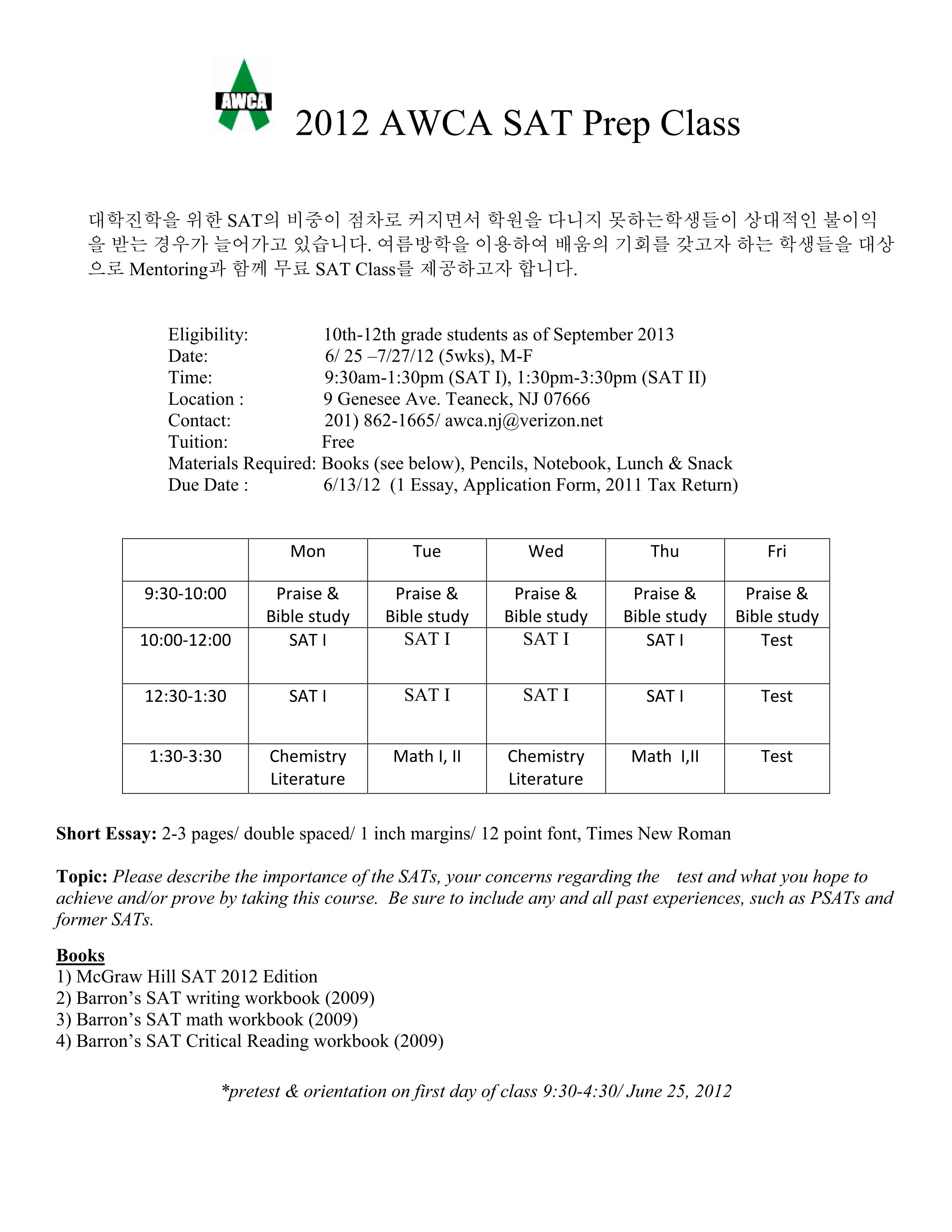 대학진학을 위한 SAT의 비중이 점차로 커지면서 학원을 다니지 못하는학생들이 상대적인 불이익을 받는 경우가 늘어가고 있습니다. 여름방학을 이용하여 배움의 기회를 갖고자하는 학생들을 대상으로 Mentoring과 함께 무료 SAT Class를 제공하고자 합니다.